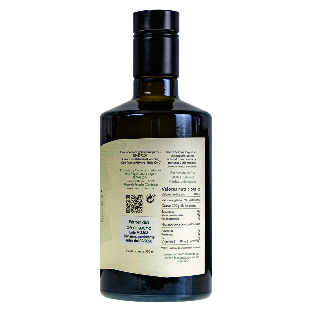 Botella 500ml de vidrio de aceite de oliva virgen extra, variedad hojiblanca, de cosecha temprana y extracción en frío. Este formato es ideal para tener un detalle con quien tú quieras y acercarlo a los placeres de degustar nuestro oro líquido.